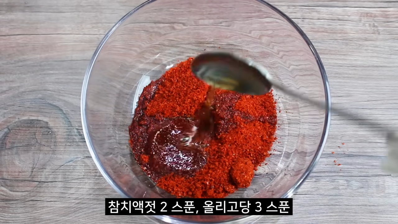 고춧가루 5스푼, 홍게액젓 5스푼, 참치액젓 2스푼, 올리고당 3스푼, 마늘 한 스푼을 넣은 후 잘 섞고 30분 숙성시킵니다.